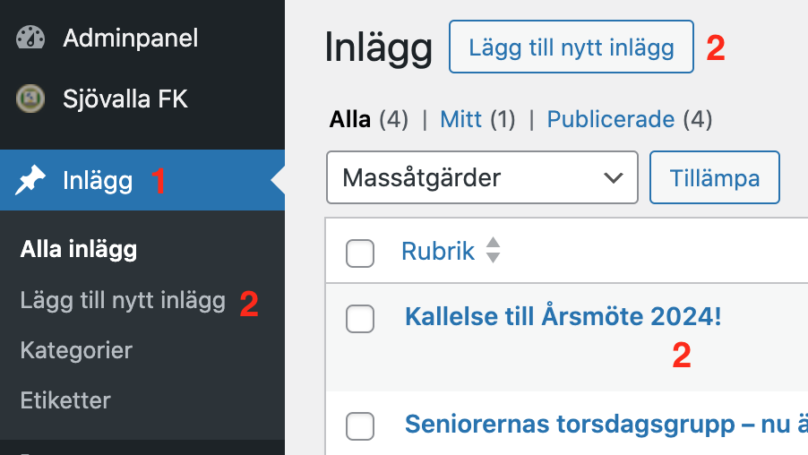 OBS! Det datum som Inlägget skapades/publicerades på kommer att visas i listan över inlägg. Se därför till att skriva med datum i namnet (första rubriken) för inlägget om detta behöver poängteras. Välj ett kort format på datum så att det ser bra ut i mobiltelefoner.